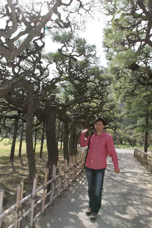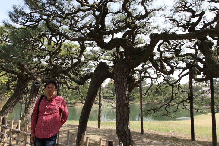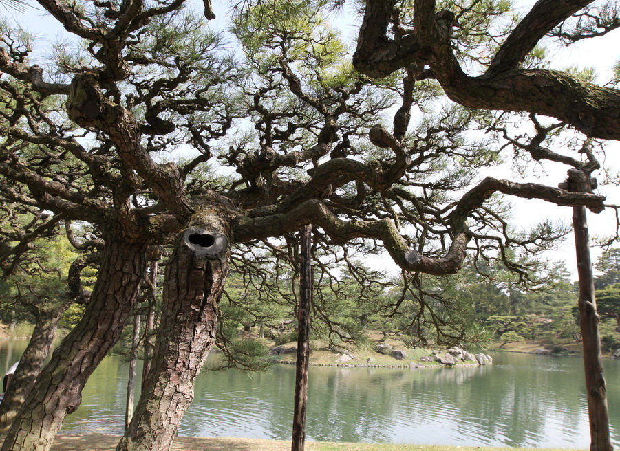 最能看出日本高度庭院技巧的是,每顆松樹的樹幹連結一起,形成根根相連的奇景