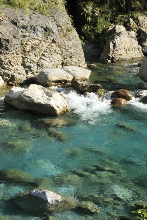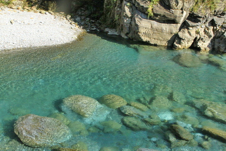 溪水中的微酸溶解大理岩中碳酸鈣成分,因此溪水 常呈現藍綠色..