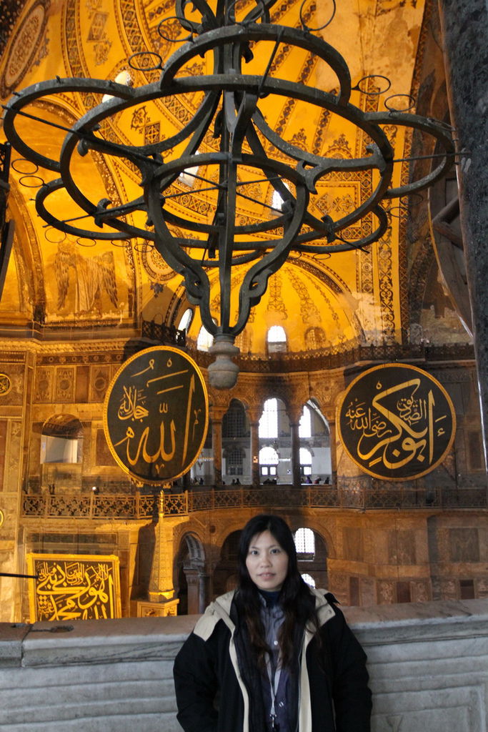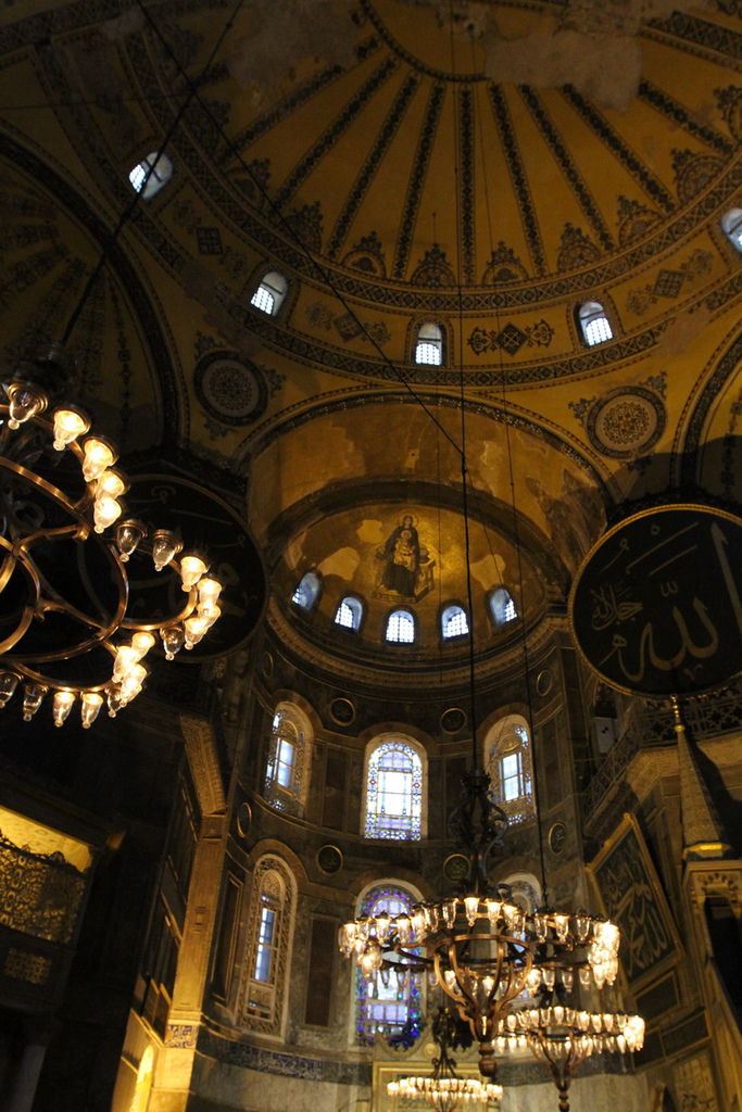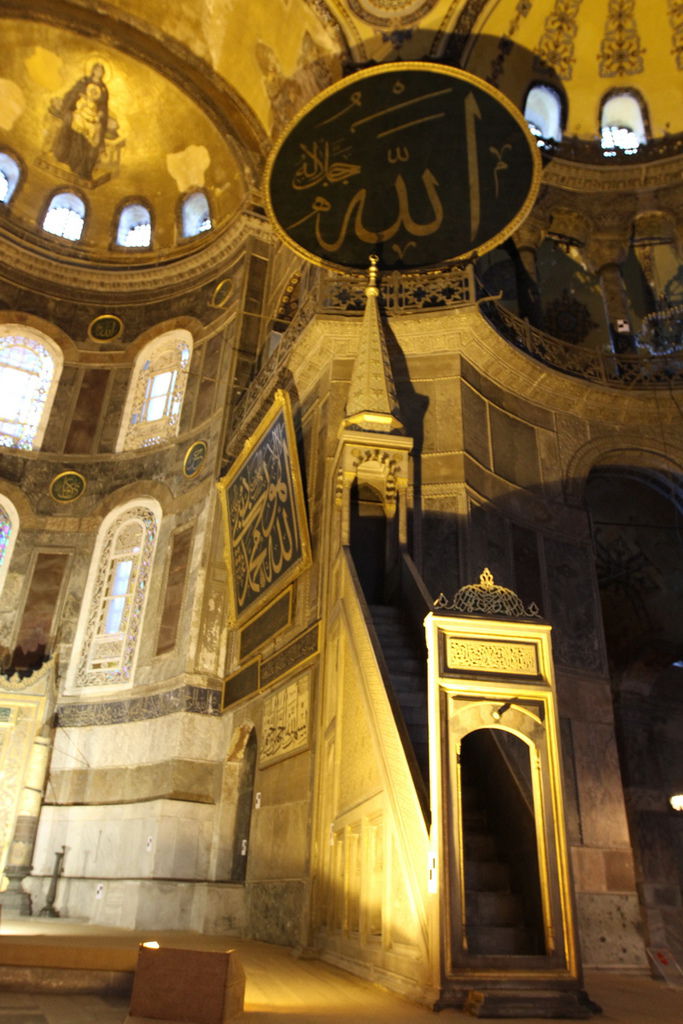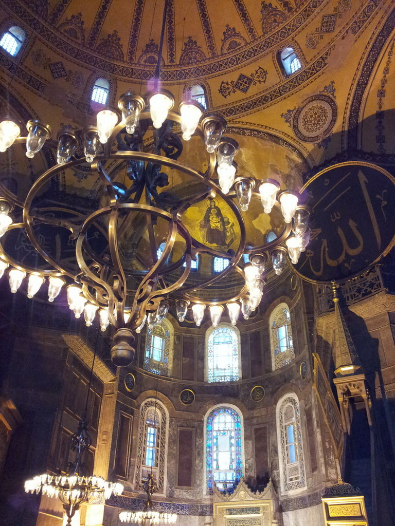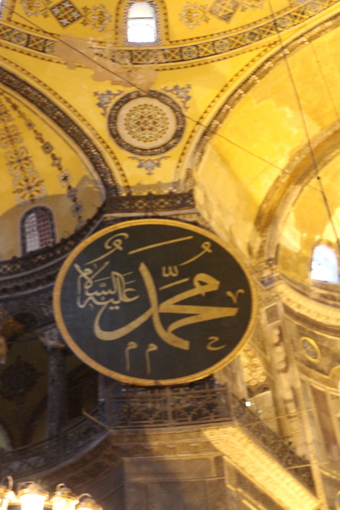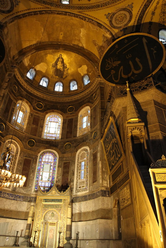 抬頭又可以見到掛在圓頂上的寫著「穆罕默德」阿拉伯文金字大圓盤,和牆上聖母抱基督的馬賽克拼貼