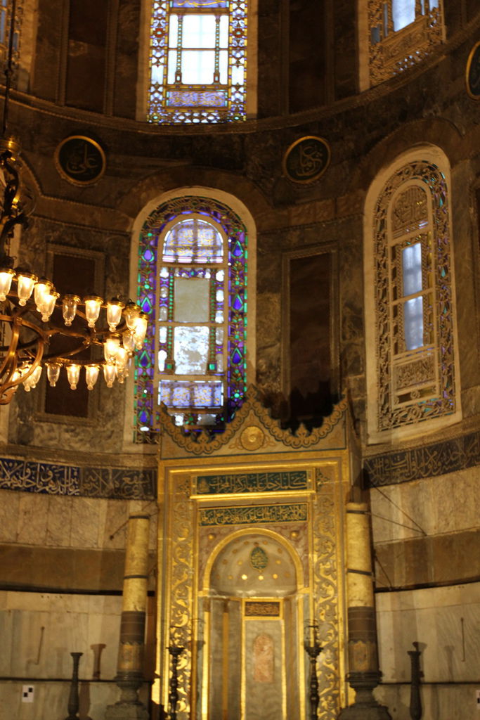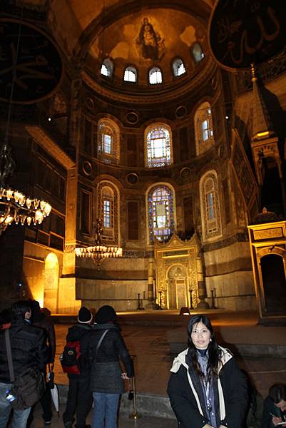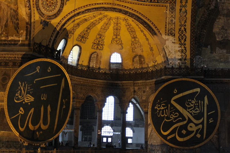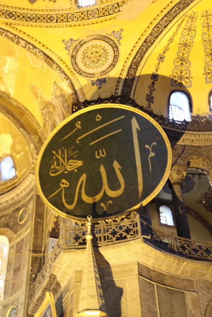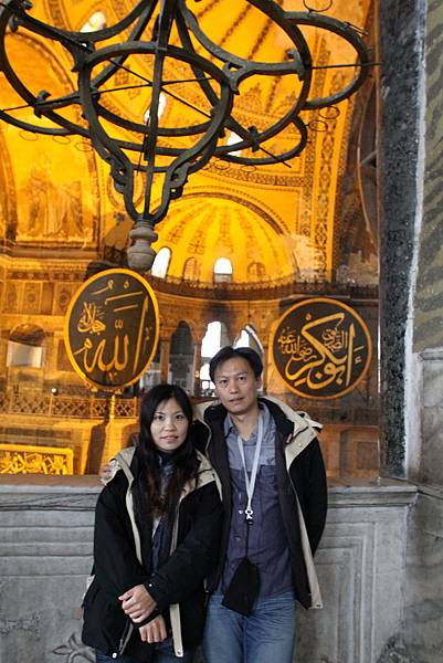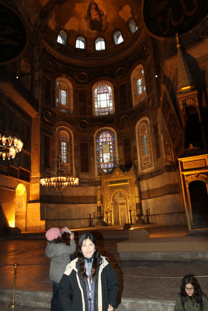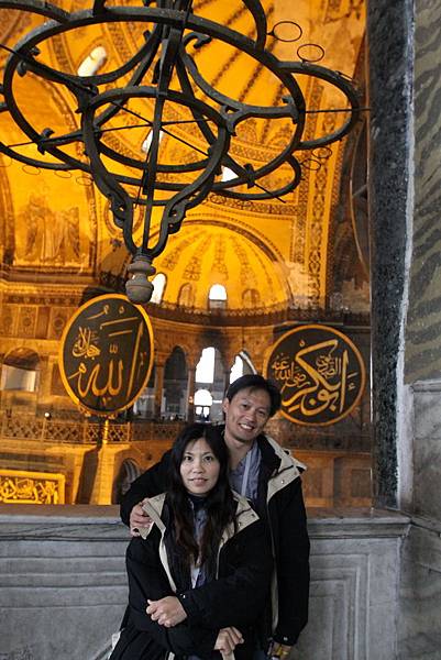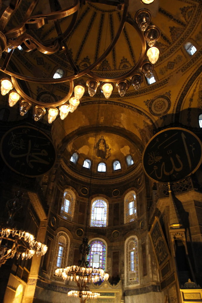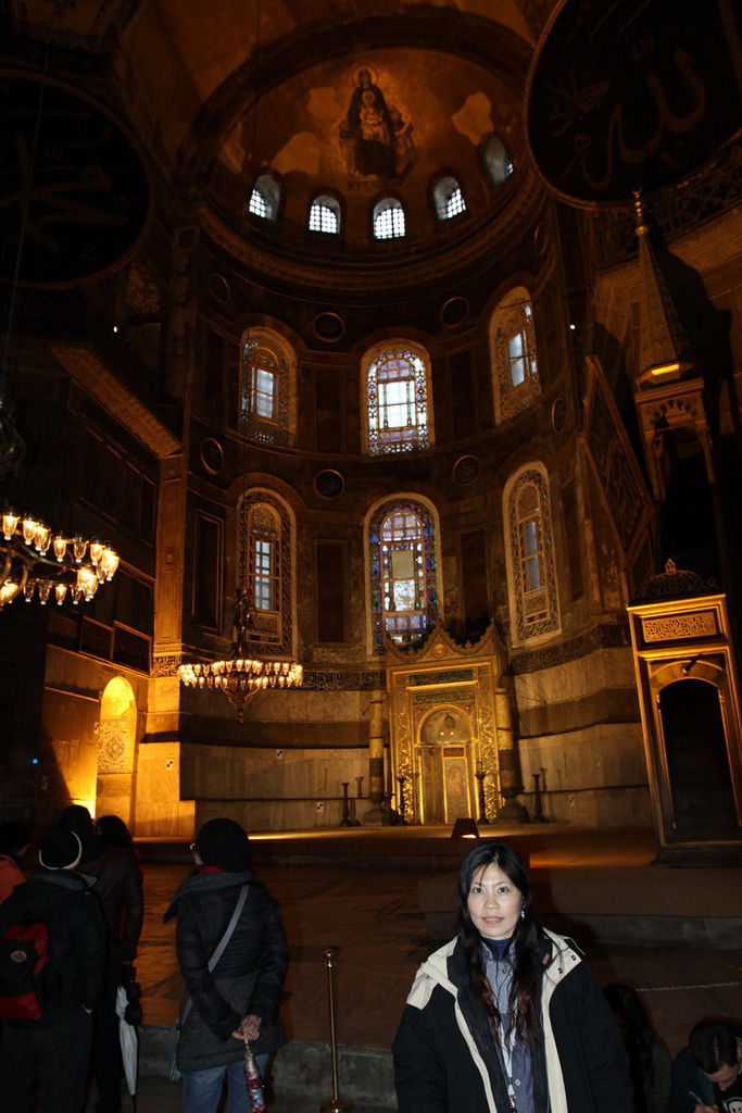 抬頭又可以見到掛在圓頂上的寫著「穆罕默德」阿拉伯文金字大圓盤,和牆上聖母抱基督的馬賽克拼貼