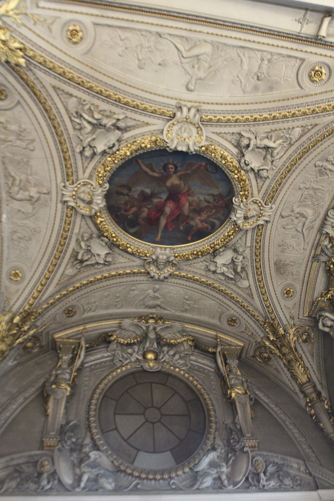 抬頭一看,天花板上繁複又精美的彩色壁畫同樣叫人讚嘆連連,是法國宮廷藝術的典型體現