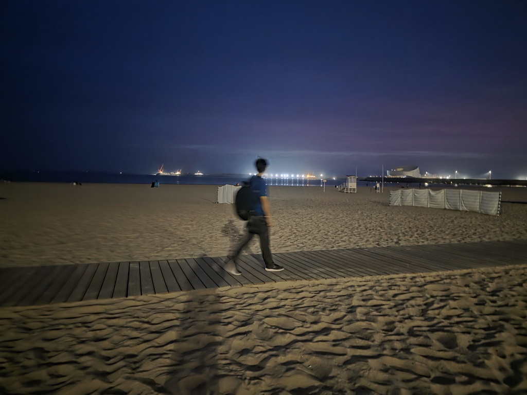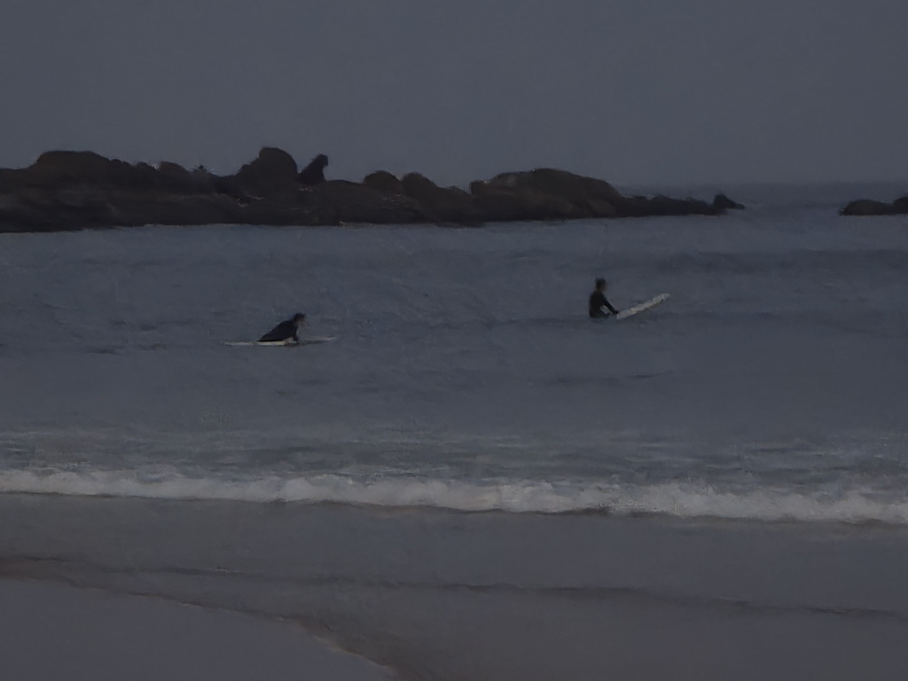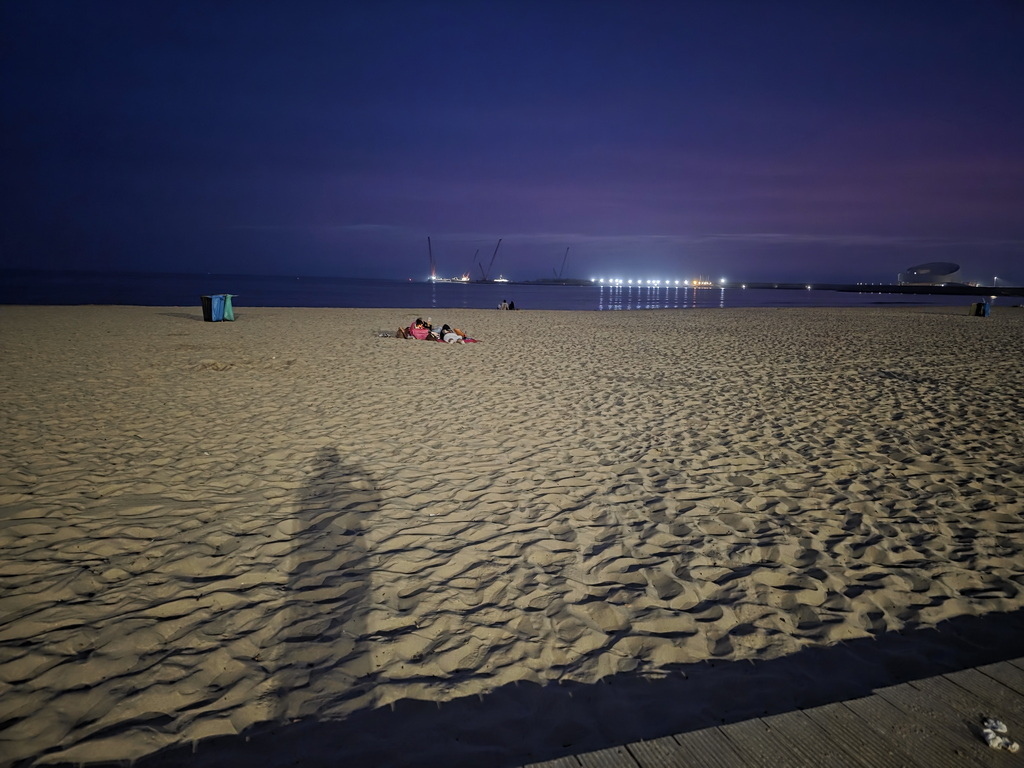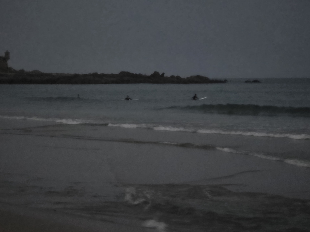 晚上9點,天還沒全黑,還看得到 有人還在玩衝浪板!