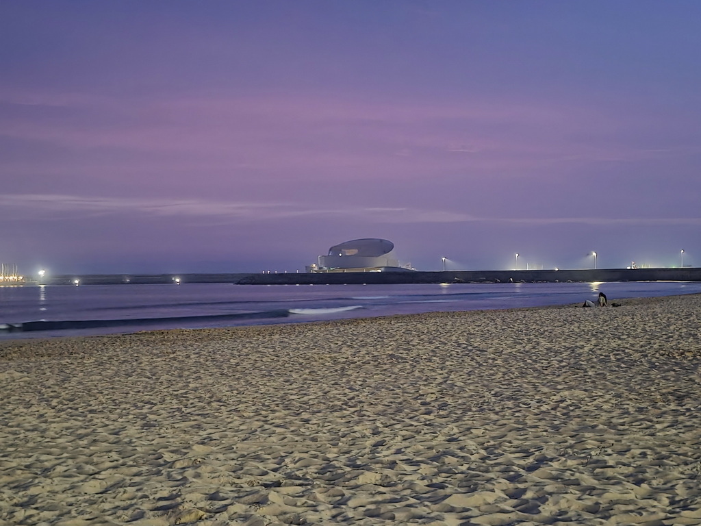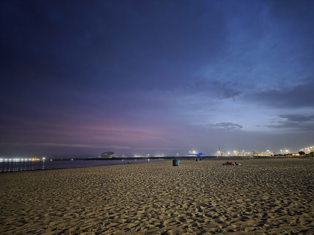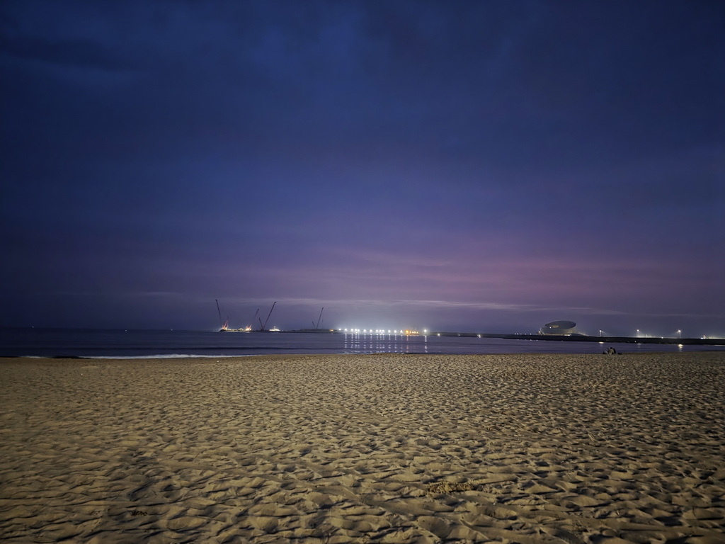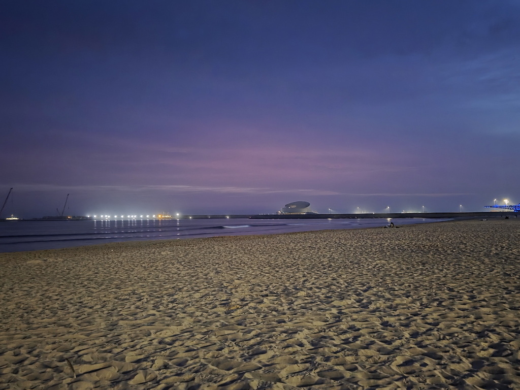 晚上9點,天還沒全黑,還看得到 有人還在玩衝浪板!