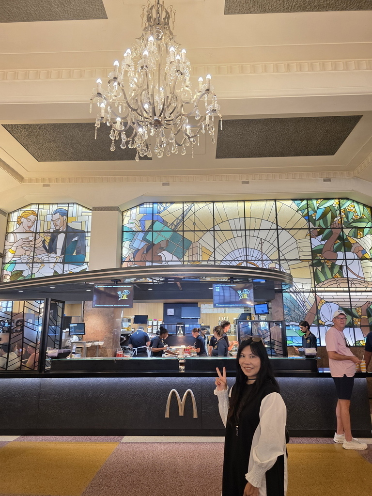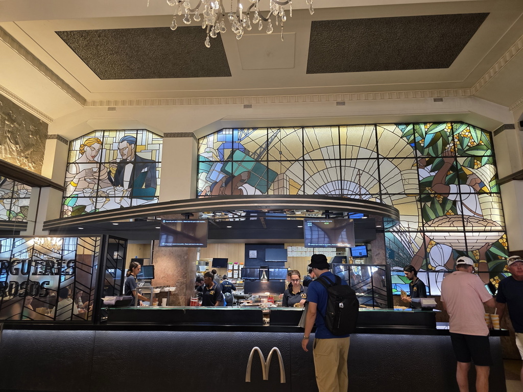 麥當勞內部也保留了許多舊時的元素,包括裝飾華美的天花板和四座宏偉的水晶吊燈,還有繽紛的彩色玻璃花窗