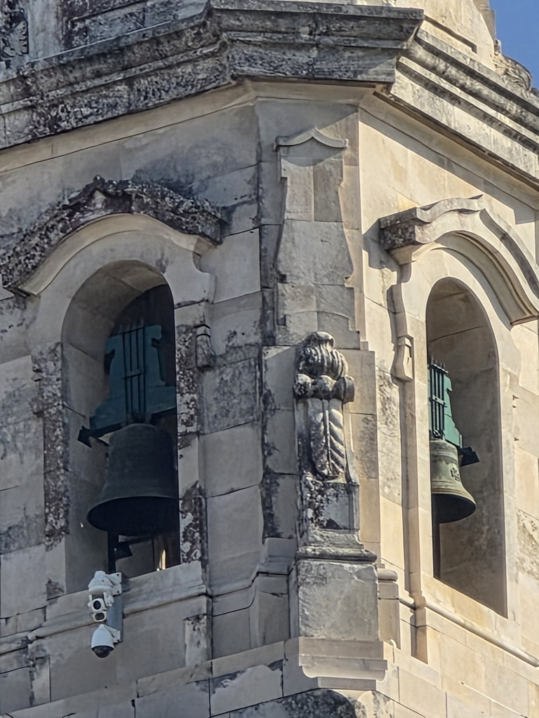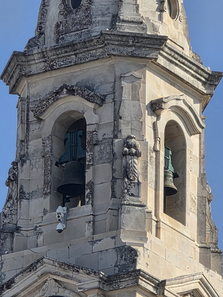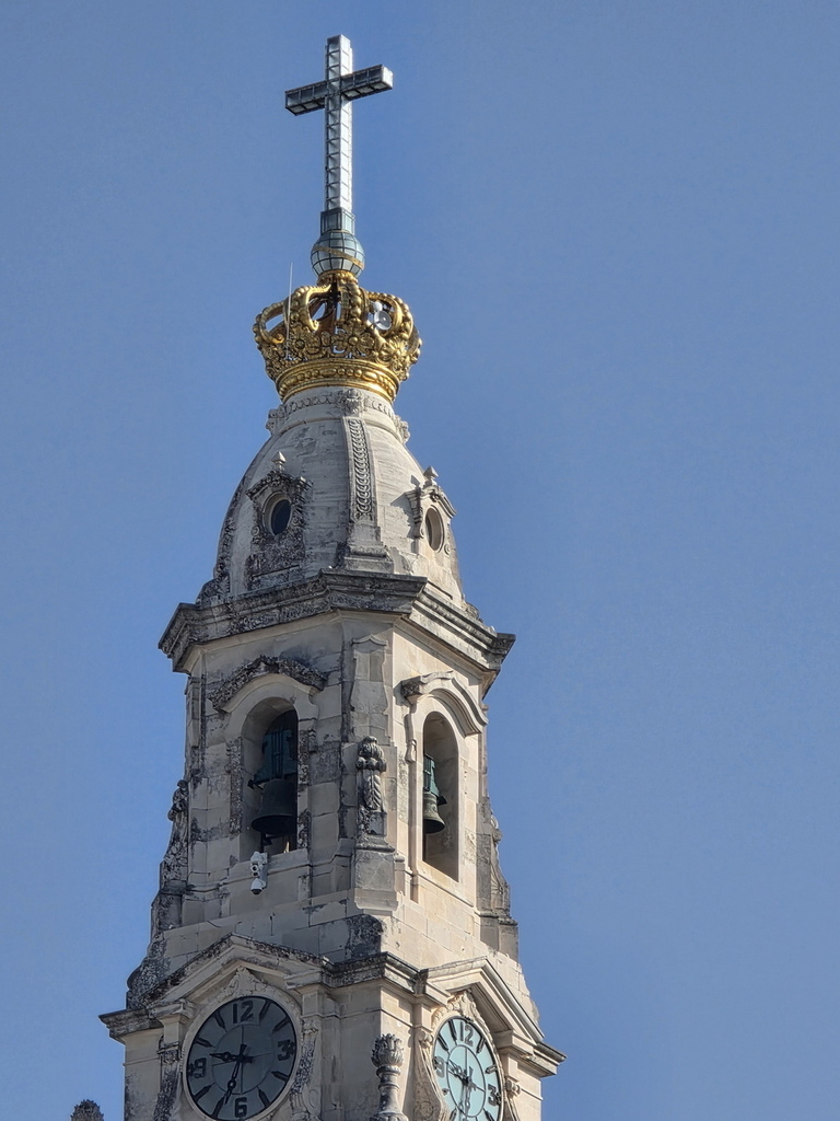 正面有一高65米的鐘樓,鐘樓頂部有一個十字架,十字架下方有一個重七千公斤的皇冠,聖殿內有大理石祭台